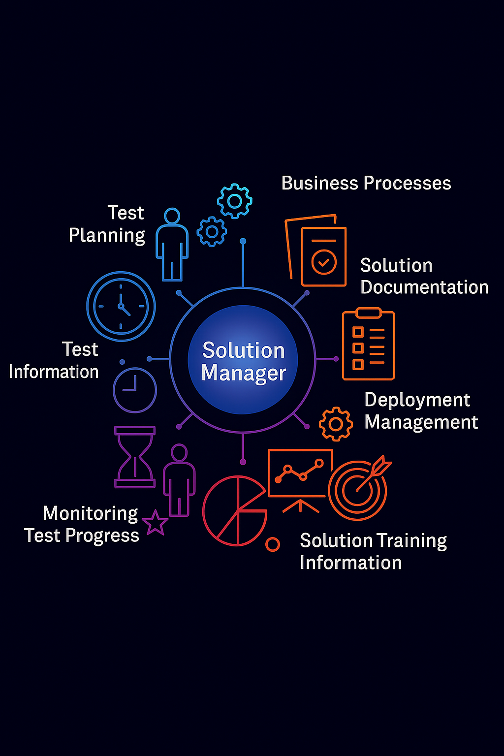 The conceptual design of our Solution & Test Manager follows a structured drill‑down approach: from system modules → processes → scenarios → specific scenario steps. At each level, users can enrich the documentation by adding notes, links, and supporting documents.
